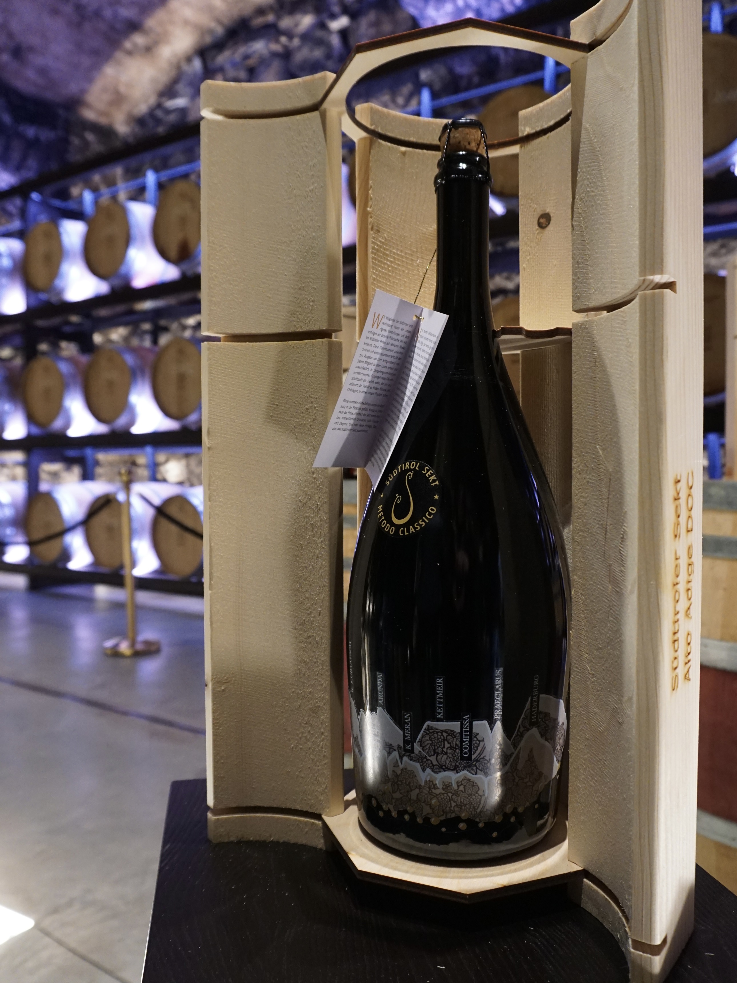 Den heute in der Kellerei Meran vorgestellten Gemeinschaftssekt der Vereinigung Südtiroler Sekterzeuger gibt es in Doppelmagnum-Flaschen und einer limitierten Auflage. Die wenigen Exemplare auf dem Markt werden ausschließlich in den Mitgliedsbetrieben der Sektvereinigung verkauft.