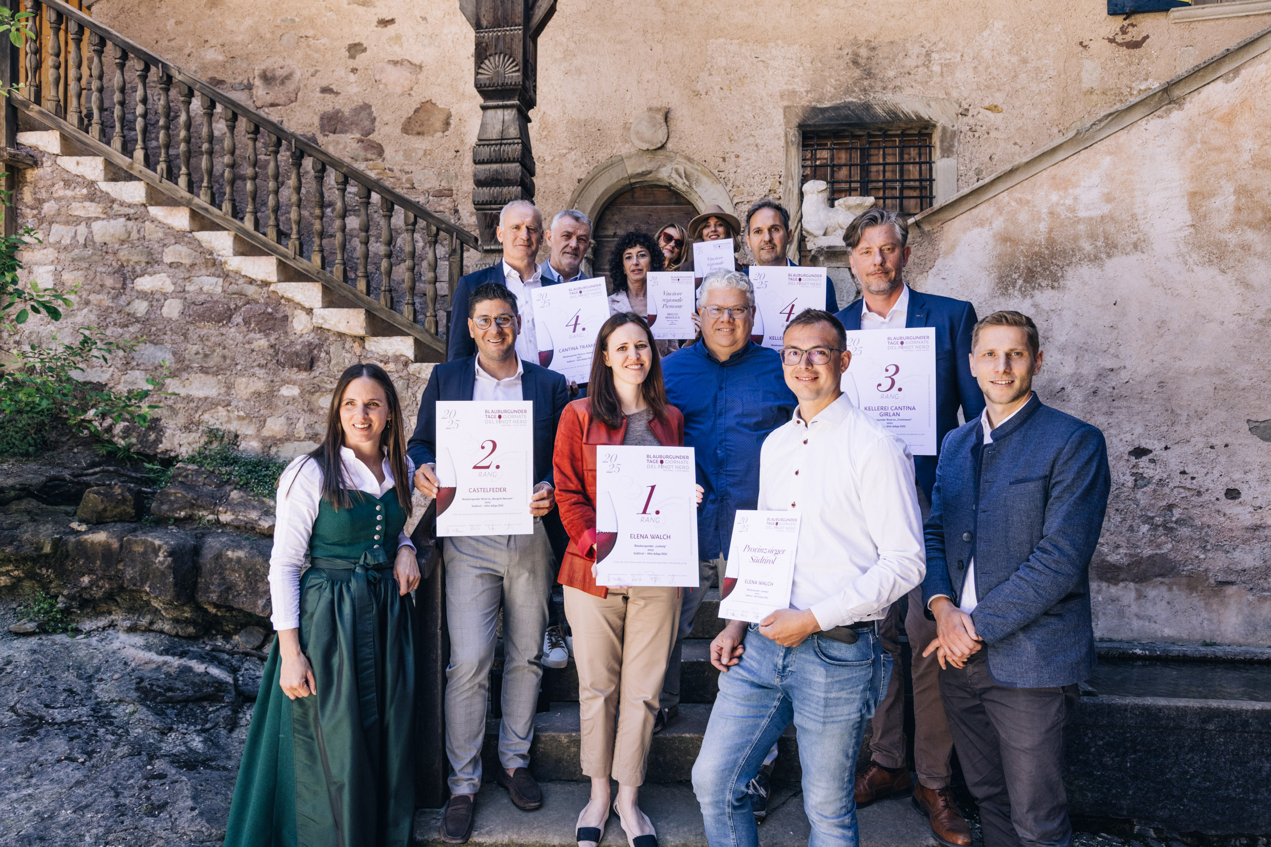 Bereits Tradition hat die Eröffnung der Blauburgundertage auf Schloss Enn von Familie Rubin De Cervin Albrizzi. Hier wurden heute im Beisein der Vertreter der beiden Gastgebergemeinden Neumarkt und Montan, Klaus Pichler und Leo Tiefenthaler, die fünf besten Blauburgunder Italiens des Jahrgangs 2022 prämiert. Sie waren zuvor von einer von Ulrich Pedri vom Versuchszentrum Laimburg geleiteten Jury aus Önologen, Sommeliers und Weinjournalisten aus allen teilnehmenden Regionen bestimmt worden.