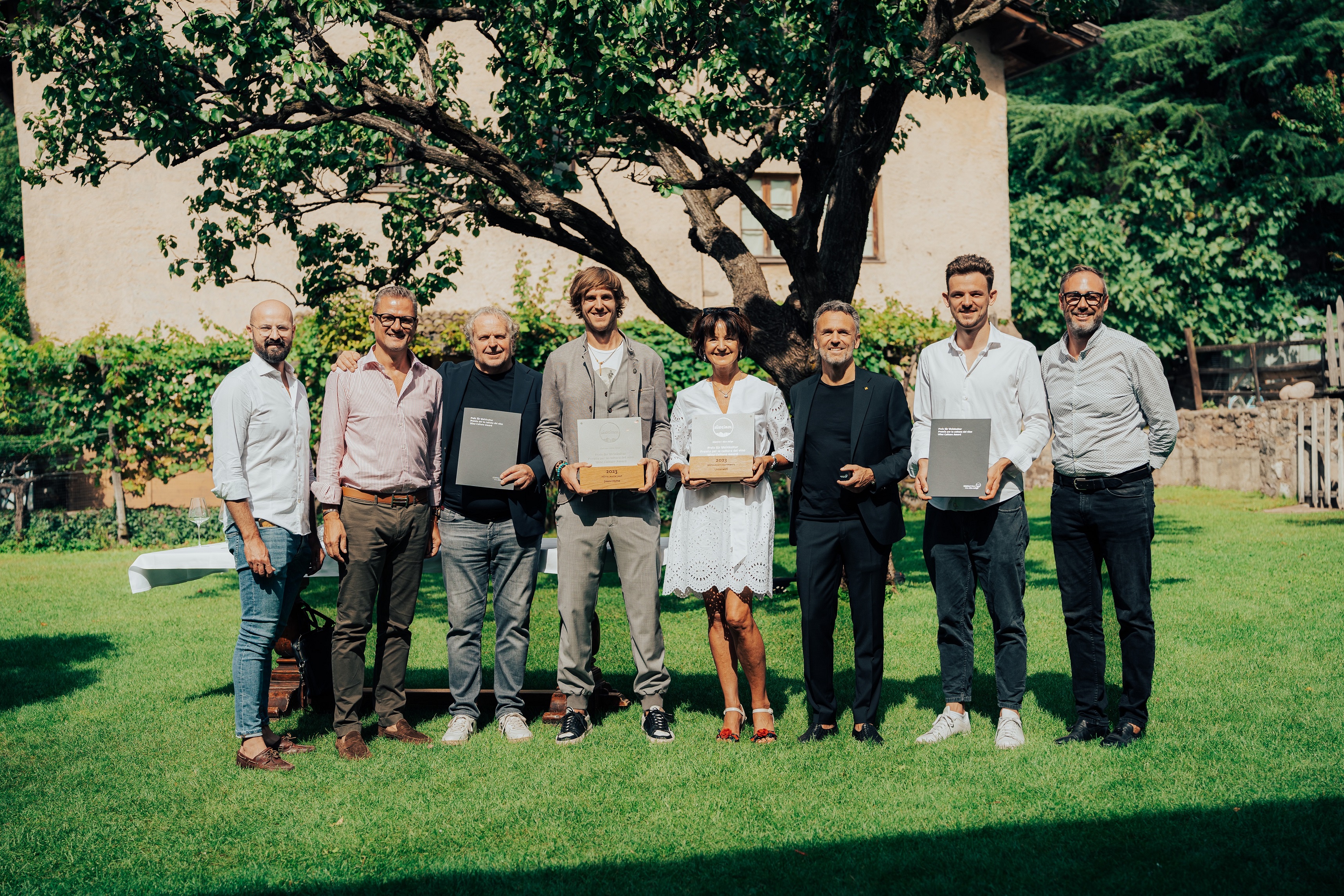 Quellenangabe: Südtirol Wein; vlnr: Eduard Bernhart (Direktor Südtirol Wein), Martin Foradori (Vize-Präsident Südtirol Wein), Jimmi und Philipp Schrott (Jimmi Hütte), Cornelia, Thomas und Alex Haselwanter (Unterwirt), Andreas Kofler (Präsident Südtirol Wein)